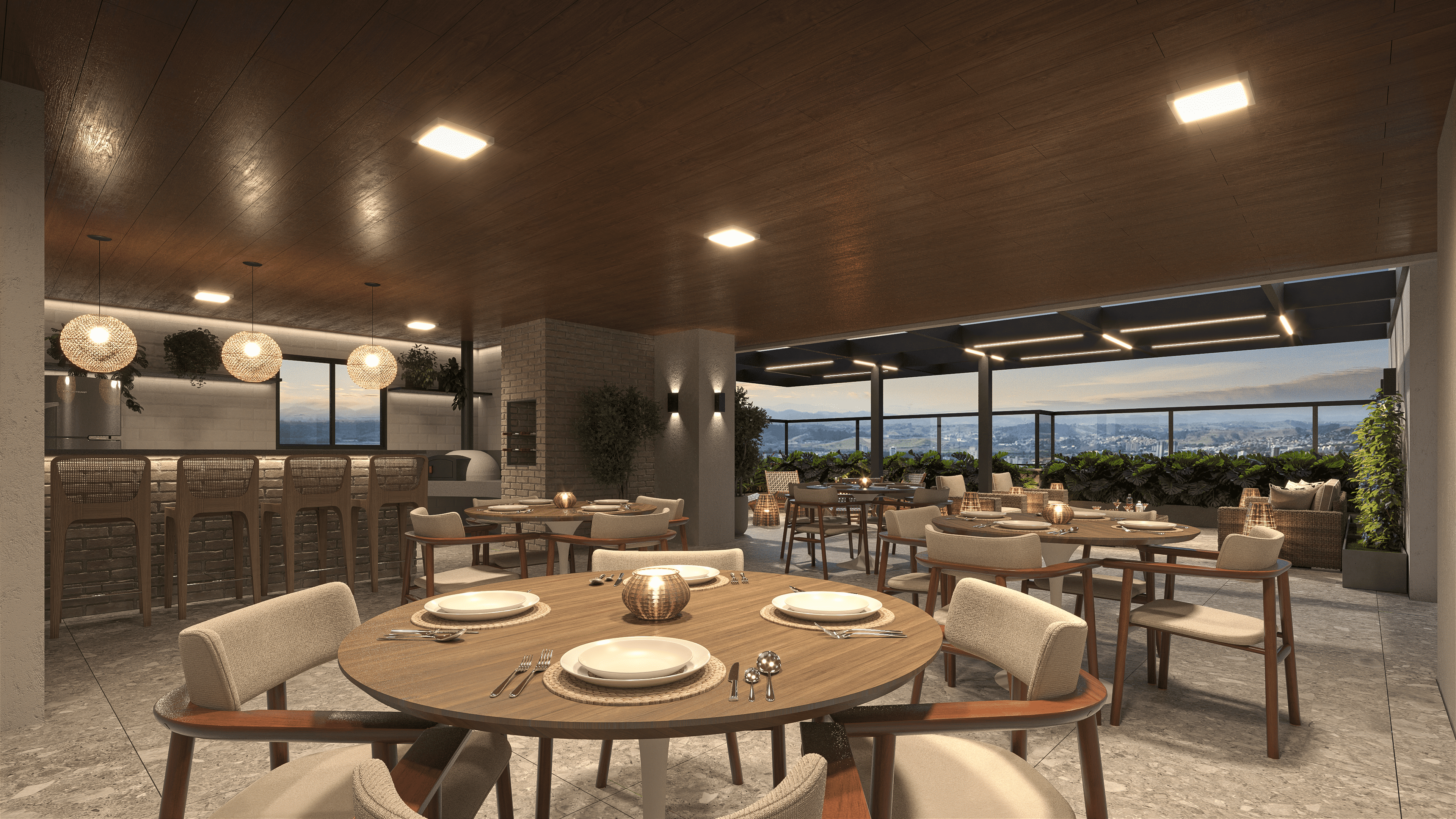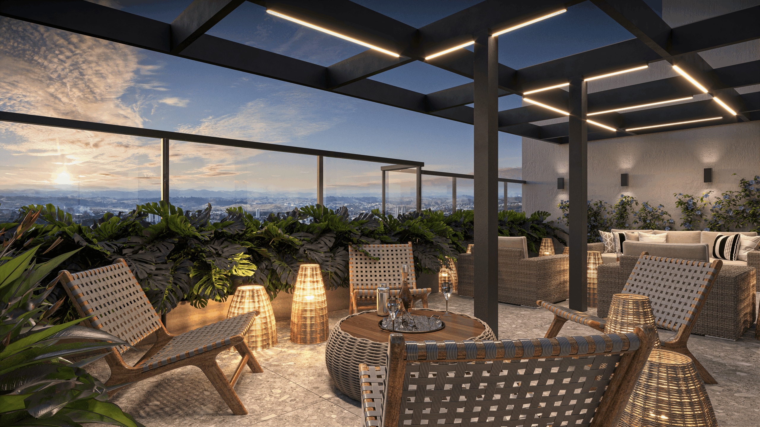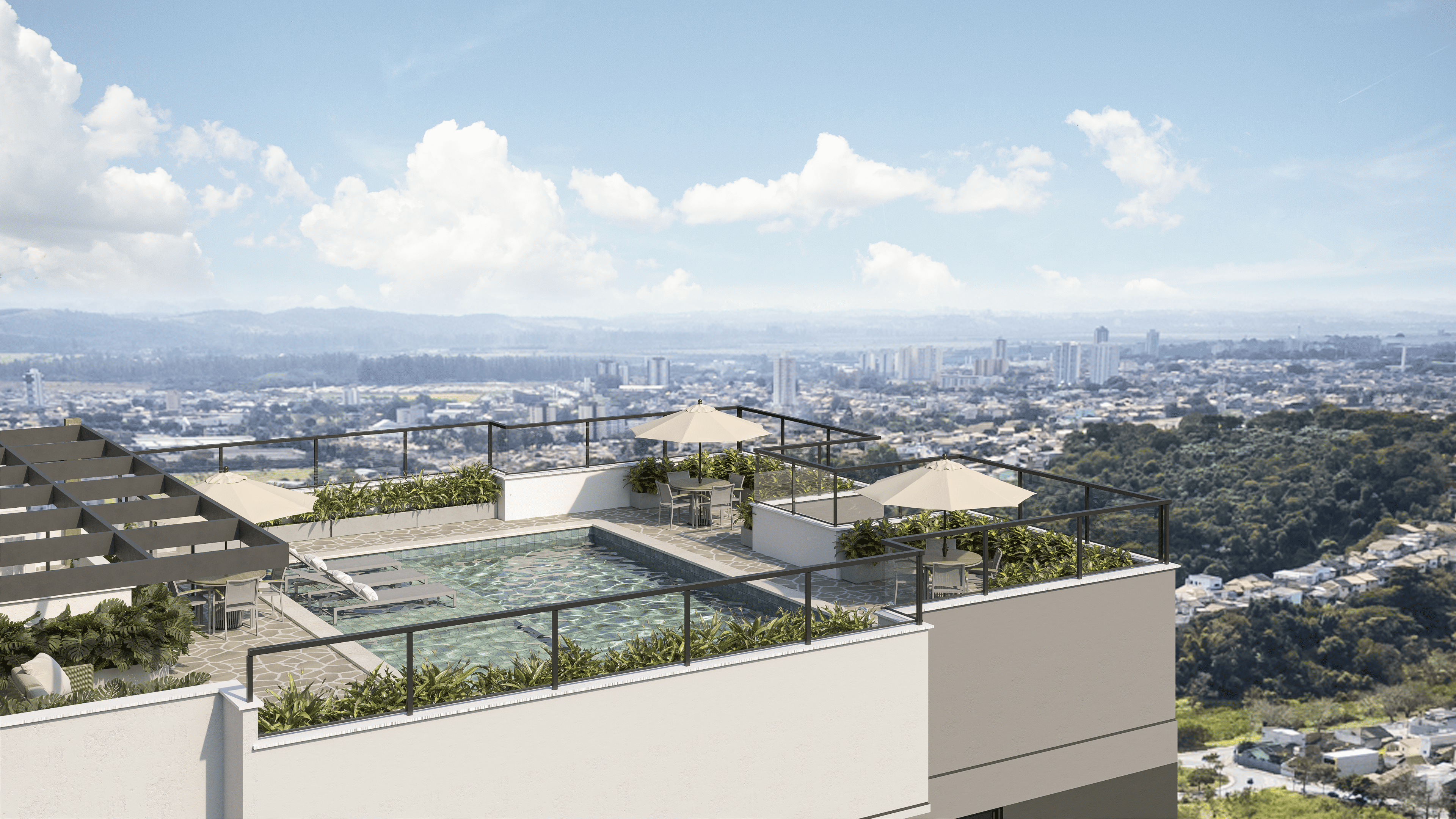 O grande destaque do empreendimento é o exclusivo lazer rooftop, o único da região, com vista panorâmica 180° do TOPO, proporcionando momentos únicos, convivência especial e uma perspectiva privilegiada da cidade.